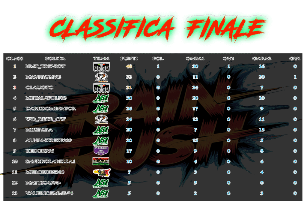 SE UN PILOTA VIENE DISCONNESSO PER VARI MOTIVI IN GARA1 POTRà PARTECIPARE A GARA2 MA PARTIRà DALL'ULTIMA POSIZIONE.